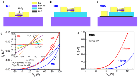 На левом графике красный – зависимость тока в мА от напряжения для MB, синее для MS при повышении-понижении V, там стрелочками показано. На правом графике ВАХ для 1 и 2 слоя MoS2 в MBG структуре.
