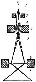 объективной линзой 4, формирующей первичное изображение 5 просвечиваемой электронами части объекта. Объективная линза дает увеличение примерно в 100 раз. Следующая за объективной промежуточная линза перебрасывает промежуточное изображение с небольшим увеличением (обычно до 10 раз) 6 в предметную плоскость проекционной линзы 7, а проекционная линза формирует окончательное сильно увеличенное изображение (проекционная линза дает увеличение до 100 раз). Таким образом, общее увеличение электронного микроскопа может достигать 100 000 раз.
