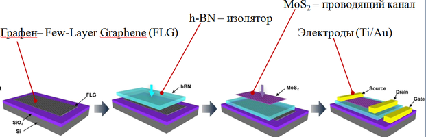 Устройство толщиной всего шесть атомных слоев использует в качестве истока, стока и затвора графен. Изолятором выступает гексагональный нитрид бора (h-BN), а каналом служит слой молибденита. Каждый слой толщиной в атом механически отслаивается и накладывается на гибкую кремниевую пластину. Слои генерируются отдельно и только потом помещаются на несущую конструкцию, что позволяет свести к минимуму структурные дефекты на молекулярном уровне.