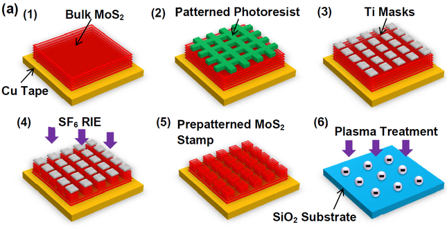 1 – исходный массивный MoS2 на медной подложке. 2 – фотолитография, фоторезист-маска. 3 – формирование титановой маски. 4 – реактивное ионное травление MoS2 гексафторидом серы. 5 – удаление титановой маски в плавиковой кислоте (HF). 6 – плазменная обработка SiO2 – подложки в кислородной плазме для электростатической зарядки поверхности