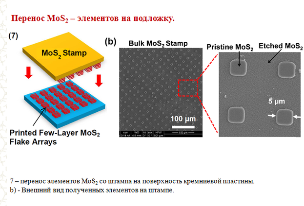 Прикладывается штамп MoS2к подложке и несколько слоев MoS2 остается на SiО2. MoS2 применяется виде нанокластеров 2-3нм и выступает в качестве катализаторов.