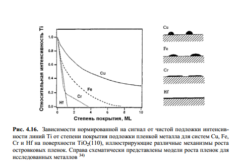 При послойном росте зависимость интенсивности спектральных линий адсорбата/конденсата и подложки от степени заполнения поверхности является линейной, и при достижении θ=1 линия от атомов подложки полностью исчезает. При островковом росте затенение сигнала подложки происходит значительно медленнее.
