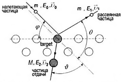 Рис.1 Схематичная диаграмма упругого двухчастичного соударения налетающего иона с массой m, кинетической энергией E0 и скоростью v0 и атома поверхности с массой M, кинетической энергией отдачи Е2 и скоростью v2