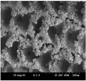 | Фотография сканирующей электронной микроскопии пластины с машинной обработкой поверхности (х500) с желобками относительно гладкой поверхности. | Поверхность, обработанная лазером. Относительно ровные поры правильной формы (х500). |