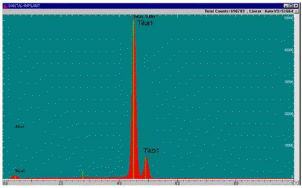 | Поверхность, обработанная лазером (х900). Поры правильной формы и структуры, с интервалом 10-12 мкм, диаметром ±25 мкм и глубиной 20 мкм. | Энергодисперсионный рентгеноспектральный анализ. Чистота поверхности, обработанной лазером. Присутствует только Титан (Ti). |