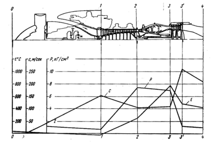 | Входное устройство Осевой многоступенчатый компрессор Кольцевая камера сгорания Осевая трехступенчатая реактивная турбина Выходное устройство | 0-0 и 1-1 1-1 и 2-2 2-2 и 3-3 3-3 и 3'-3' 3'-3' и 4-4 |