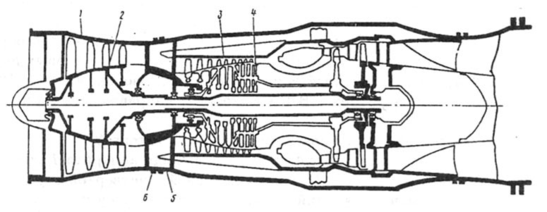 | Рис. 9. Силовая схема ТРДД 99.01: 1 - наружный корпус; 2- ротор низкого давления; 3- внутренний корпус; 4 - ротор высокого давления; 5 - промежуточный корпус; 6 - узлы крепления к самолету |