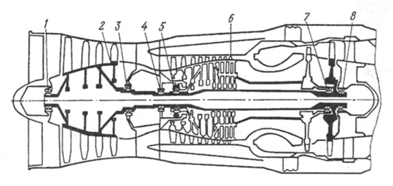 | Рис. 8. Схема роторов и опор ТРДД 99.01: 1 - роликовый подшипник передней опоры ротора КНД; 2 - ротор низкого давления; 3 - шариковый подшипник задней опоры ротора КНД; 4 - роликовый подшипник передней опоры ротора ТНД; 5 - шариковый подшипник передней опоры ротора высокого давления; 6 - ротор высокого давления; 7- роликовый подшипник задней опоры ротора высокого давления; 8 - роликовый подшипник задней опоры ротора ТНД |