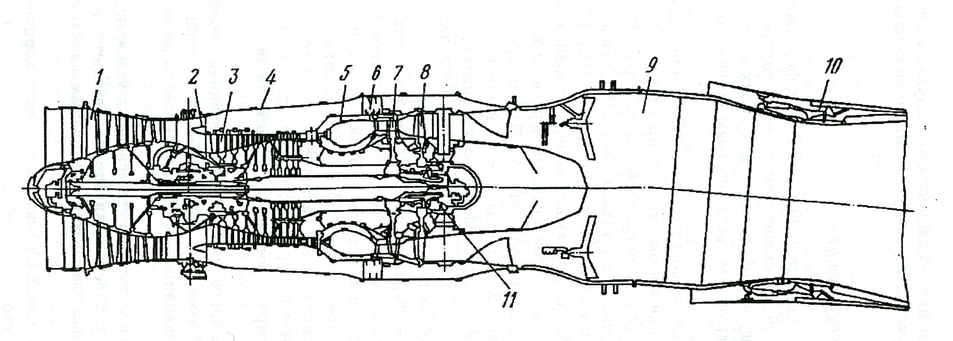 | Рис. 10. Продольный разрез ТРДД 99.01: 1 - КНД; 2 – промежуточный корпус; 3 – КВД; 4 – наружный контур; 5 – основная турбина; 6 – воздухо-воздушный теплообменник; 7 – ТВД; 8 – ТНД; 9 – форсажная камера сгорания; 10 – реактивное сопло; 11 – опора турбины |