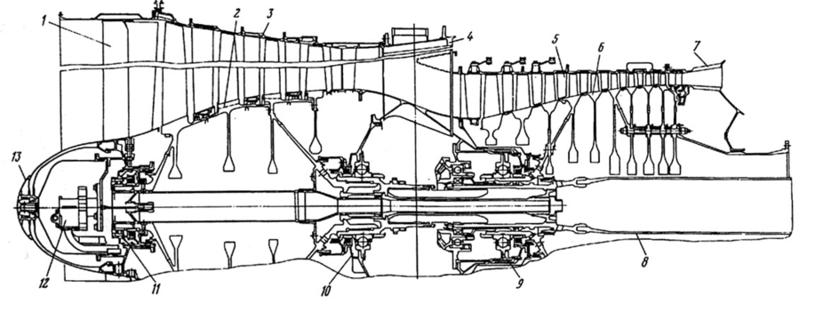 | Рис. 11. Продольный разрез компрессора ТРДД 99.01: 1 – входной направляющий аппарат; 2 – ротор КНД; 3 – статор КНД; 4 – промежуточный корпус; 5 – статор КВД; 6 – ротор КВД; 7 – основная камера сгорания; 8 – вал ротора ТНД; 9 – передняя опора КВД; 10 – задняя опора КВД; 11 – передняя опора КНД; 12 – откачивающий маслонасос; 13 – обтекатель («кок») |