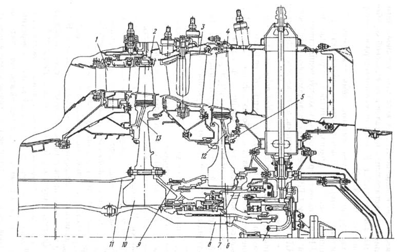 | Рис. 12. Продольный разрез турбины ТРДД 99.01: 1 – сопловой аппарат ТВД; 2 – лопатка рабочего колеса ТВД; 3 – сопловой аппарат ТНД; 4 – лопатка рабочего колеса ТНД; 5 – напорный диск; 6 – диск ТНД; 7 – цапфа ротора ТНД; 8 – вал ротора ТНД; 9 – цапфа ротора ТВД; 10 – диск ТВД; 11 – вал КВД; 12, 13 – отверстия в диске ТНД и ТВД соответственно |