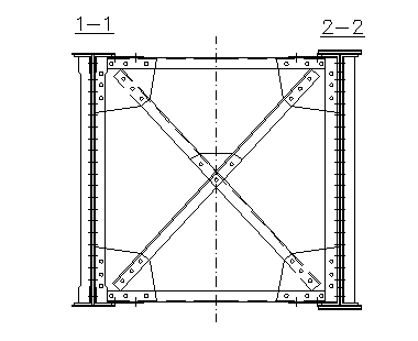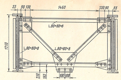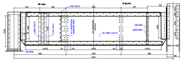 Прикрепление поперечной балки к фермам пролетного строения выполнено без развития высоты балки вблизи фермы. Уголки прикрепления протянуты несколько выше поперечной балки, расположены выше пояса. Крайние поперечные балки снабжены парными уголками жесткости в местах установки домкратов. Поперечные балки не имеют как верхних, так и нижних горизонтальных листов. Крепление поперечной балки к фермам показано на (рис.1.7)