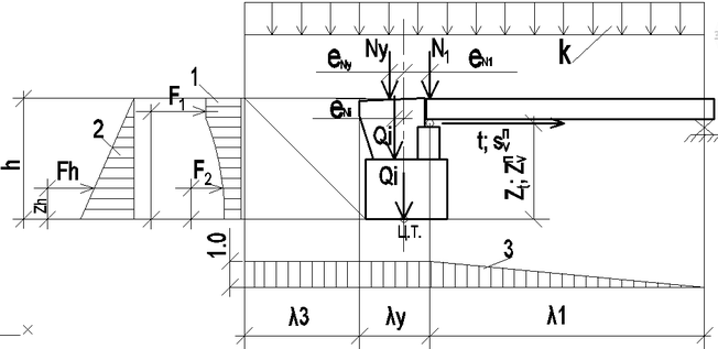 1 – эпюра горизонтального (бокового) давления на устой от транспортных средств на призме обрушения; 2 – эпюра бокового давления от собственного веса грунта; 3 – линия влияния вертикальных нормальных сил