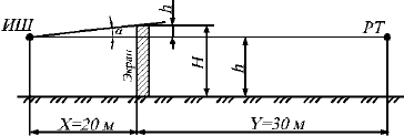 Расчетная точка (РТ) в зоне жилой застройки и источник шума (ИШ) расположены на одном уровне. Расстояние от экрана до наиболее удаленного ИШ- х = 20 м. Вычертим поперечный разрез места расположения ИШ, экрана и РТ (рисунок8.1).