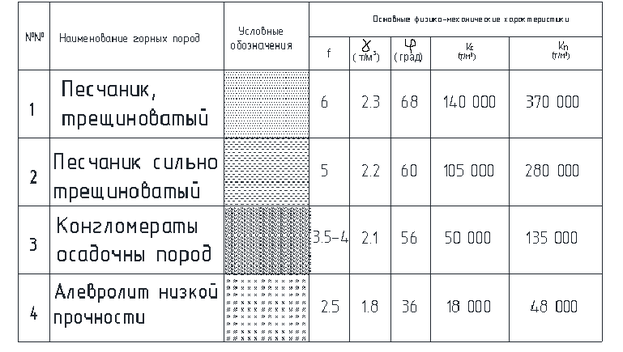 Примечание: f - коэффициент крепости по М. М. Протодьяконову; γ - удельный вес породы; φ - угол внутреннего трения; Кс - коэффициент упругого отпора за стеной; Kn - коэффициент упругого отпора под подошвой обделки.
