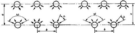 Рисунок 4.1 – Рекомендуемое расположение световых приборов для общего равномерного освещения территории стройплощадки: ω - угол охвата, град.; τ - угол между оптическими осями, град.; a - ширина освещаемой площади, м; b - расстояние между мачтами, м.