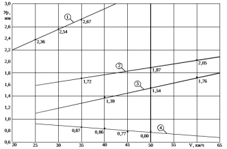 В Амурском тоннеле с деревянными шпалами, толщиной щебня 10 см над обратным сводом (прямая 1) зарегистрированы наибольшие прогибы рельсов. В Северо-Муйском тоннеле при безбалластной конструкции пути с железобетонными шпалами со скреплением КБ-65, утопленными в бетон прогибы и интенсивность их прироста значительно меньше и при скорости 60 км/ч прогиб составлял 2,05 мм (прямая 2). Еще меньше в 1,16-1,24 раза прогиб зарегистрирован в Кипарисовском тоннеле, в котором малогабаритные рамы МГР-4т замоноличены бетоном, скрепление КБ-65 (прямая 3). Наименьший прогиб с уменьшением его величины с ростом скорости получен в Тарманчуканском тоннеле (прямая 4). Безбалластная конструкция пути состояла из малогабаритных рам МГР-4т, пришпиленных к путевому бетону, со скреплением КБ-65 и нашпальными прокладками повышенной упругости ОП-398. После пропуска около 50 млн. т брутто упругие прокладки в скреплении практически полностью потеряли упругие свойства. Это и определило такой характер прогиба рельса.