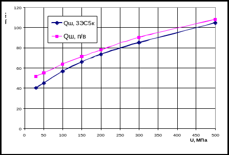 По данным рисунка 3.6 видно, что изменение величины U с 50 МПа до 500 МПа дает повышение давления Qш с 55 кН до 108 кН, практически в 2 раза. Это приводит к предельному напряженному состоянию в наиболее слабых элементах подрельсового основания: в упругих прокладках и в земляном полотне из глинистых грунтов.