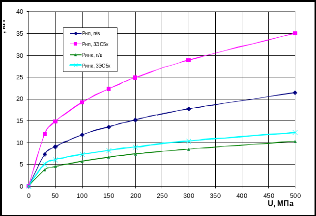 Увеличение жесткости пути приводит к резкому росту дополнительных инерционных сил при взаимодействии колес с рельсами за счет наличия неровностей на пути и на колесах. Изменение силы РИНК, РННК и РНП от модуля упругости приведено на рисунке 3.7 и рисунке.3.8.