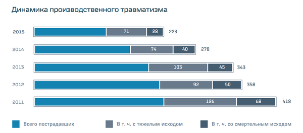В 2015 г. в ОАО «РЖД» было допущено 223 травмы на производстве, из них 28 со смертельным исходом. Основными видами происшествий, при которых погибло наибольшее количество работников, в 2015 году стали наезды подвижного состава (погибло 13 человек), воздействие электрического тока (четверо погибших) и дорожно-транспортные происшествия. Данные виды происшествий попадают в область повышенного риска и требуют принятия первоочередных мер по их предупреждению. В 2015 г. количество травмированных в результате поражения электрическим током по отношению к 2014 г., хотя и было снижено по общему травматизму на 22 %, а смертельному на 43 %, тем не менее составило соответственно 14 и 4 человека. Электротравмы получили три человека на Московской железной дороге (из них двое — смертельные). По два человека травмированы на Южно-Уральской, Забайкальской и Куйбышевской железных дорогах, по одному — на Восточно-Сибирской, Западно-Сибирской, Юго-Восточной и со смертельным исходом — на Северной и Дальневосточной железных дорогах. Неудовлетворительное положение сложилось в хозяйстве автоматики и телемеханики Центральной дирекции инфраструктуры. В Куйбышевской дирекции инфраструктуры допущен групповой случай электротравматизма. В обоих случаях одна и та же причина — работа в условиях, когда расстояние до устройств контактной сети было менее допустимых 2 м. При этом работа проводилась без оформления наряда, без отключения напряжения с устройств контактной сети и допуска работниками дистанции электроснабжения.
