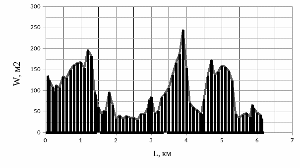 Рисунок 2.3 – График площадей поперечных сечений и объемы земляных работ для первого варианта новой трассы
