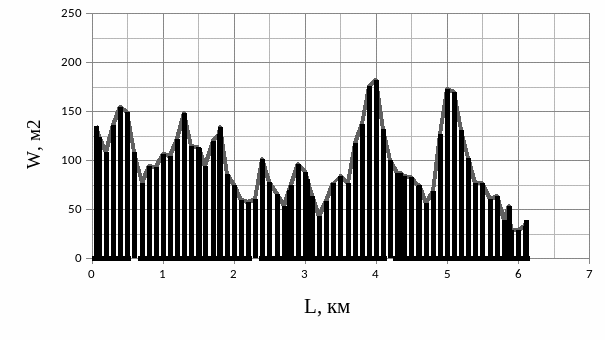 Рисунок 2.4 – График площадей поперечных сечений и объемы земляных работ для второго варианта новой трассы