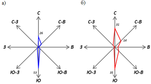 Рисунок 1.1 – Розы ветров: а – роза ветров, Январь; б – роза ветров, Июль