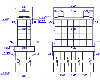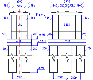 В 1-ом варианте фундамент с низким монолитным ростверком на буронабивных столбах диаметром 1.5 м. Количество столбов – 8 шт. Глубина погружения 12 м с заглубление в аргиллит очень низкой прочности размягчаемый в воде сильновыветлый до состояния твердой глины. Основные размеры ростверка и расположения буронабивных столбов показаны на рисунке 5.7