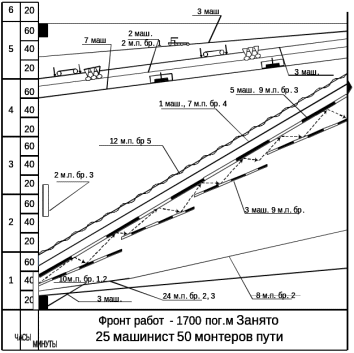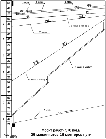 Состав работников, обслуживающих машины и механизмы, определяется по технической характеристике средств механизации, на рисунке 4.3.1 представлен график производства основных работ в «окно» по укладке путевой решетки.