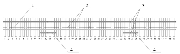 1- Ось звена. 2- инвентарные рельсы. 3- места строповки звена. 4-Строповочные рубки.