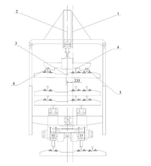 1- Ось земполотна и пути колеи 1520 мм. 2- Ось пути колеи 1067 мм и крана. 3- Ось вывешенного звена.4- Инвентарные рельсы. 5- Строповочные рубки.