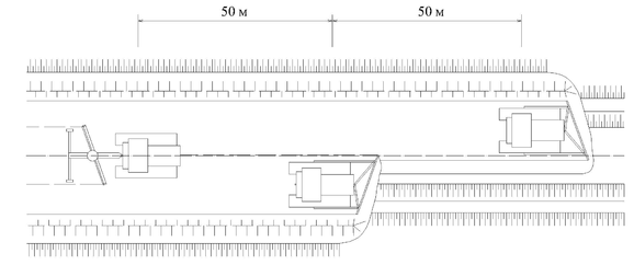 Рис 3.2. Схема расстановки бульдозеров и грейдера при срезке старого балласта.