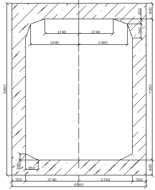 Обделка типа 2 (рисунок 1.7) на участке от ПК 4+52 до ПК 9+12 (460 м.) выполнена в виде прямоугольника и по внешнему контуру. Толщина стен 70 см., толщина верхнего перекрытия – 80 см.