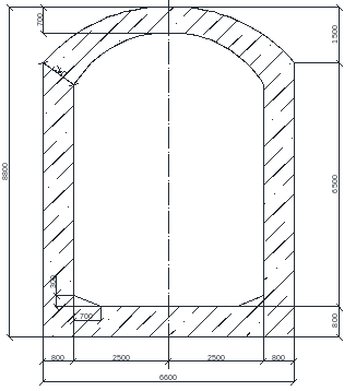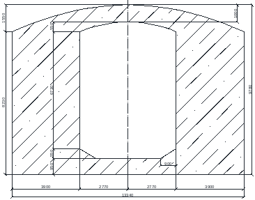 Обделка типа 1(рисунок 1.6) на участке ПК 4+04 до ПК 4+52 (48 м. от левобережного портала) имеет прямые стены толщиной 380 см. и кровлю, очерченную по дуге круга толщиной 100 см.