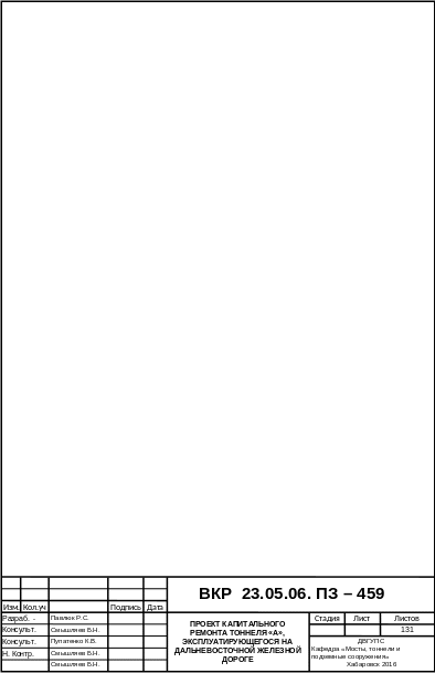 Согласно заданию на дипломный проект, необходимо разработать проект капитального ремонта подводного железнодорожного тоннеля «А» эксплуатирующегося на Дальневосточной железной дороге. Существующий однопутный железнодорожный тоннель построен с 1937 по 1941 годы. Тоннель «А» делиться на 3 участка – горный (длиной 2652,75 м), подводный (длиной 3462, 25 м) и пойменный (длиной 1296 м). Полная длина тоннеля составляет 7411 м, путь на балласте.