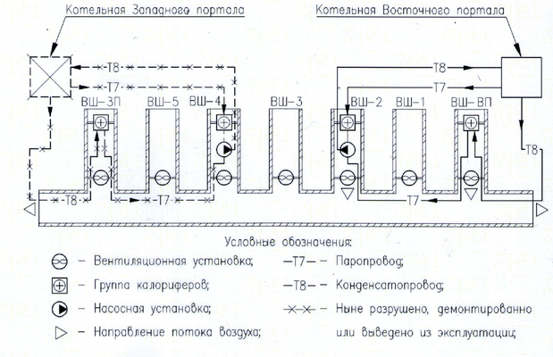 Теплоснабжение калориферных групп, установленных в ВШ-ВП и ВП-2, производится от Котельной Восточного портала. Котельная западного портала выведена из эксплуатации.