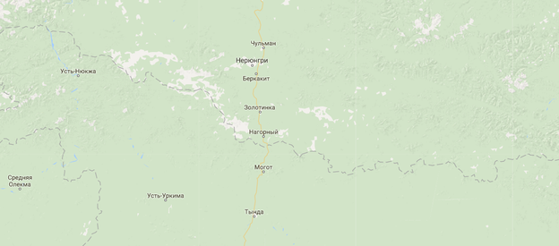 Местонахождение путепровода подлежащего реконструкции приведено на снимке «Google maps» участка трассы А360 (рисунок 2.1). Ближайшие населенные пункты: Нерюнгри, Серебряный Бор, Беркакит, Чульман.