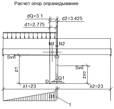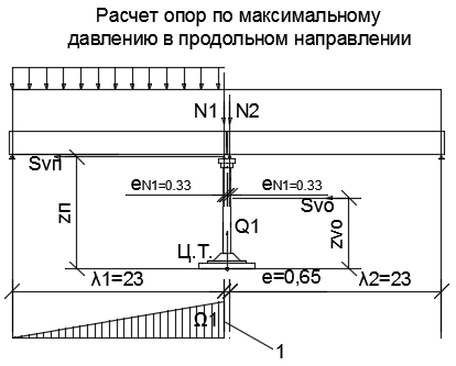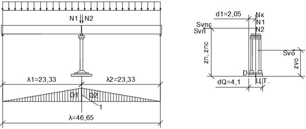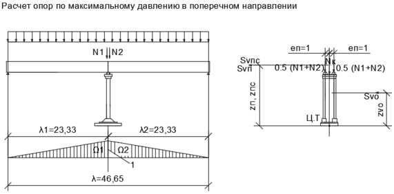 Временной вертикальной нагрузкой по схеме загружения промежуточной опоры в поперечном направлении загружают оба пролета (рисунок Б.3). Величину допускаемой временной вертикальной нагрузки вычисляют пот ой же формуле (Б.10), что ид ля расчета в продольном направлении. Применительно к расчету опоры в поперечном направлении значения моментов и площадей линии влияния подсчитывают по следующим формулам: