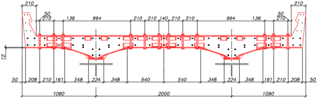 Расчет класса пролетного строения после усиления производим аналогично расчету класса пролетного строения без усиления, учитывая изменившийся геометрический фактор и берем сечения стыка с максимальным изгибающим моментом. Материал металла усиления низколегированная сталь марки 10ХСНД. Расчет выполним для пролетного строения расчетной длинной 23.0 м.