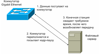 Управление потоком при дуплексном режиме работы является необходимой дополнительной функцией, позволяющей принимающему узлу (например, порту сетевого коммутатора) при условии переполнения дать узлу - источнику команду (например, файловому серверу) стоп для передачи кадров на незначительный временной интервал (см. рисунок 1.2).