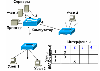 Коммутатор применяет таблицу коммутации для пересылки трафика. В то время, когда на один его порт приходит пакет данных, он забирает из него информацию о МАС-адресе приемника и ищет МАС-адрес в своей таблице коммутации как изображено на рисунке 1.1.