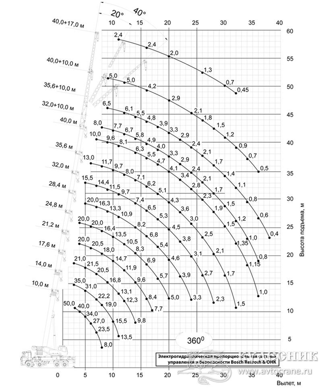 | Грузоподъемность максимальная, т/вылет, м | 50/3,2 |