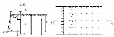 Разработку траншеи производим методом шпуровых зарядов. При методе шпуровых зарядов обычно производят серийное взрывание, которое позволяет разрыхлить требуемый объём скальных пород. Для обеспечения высокого качества взрывных работ при размещении серии шпуровых зарядов следует учитывать число и взаиморасположение свободных плоскостей разрабатываемого массива, крепость и трещиноватость горных пород, а также способ взрывания зарядов. Шпуры необходимо располагать так, чтобы расчетная линия сопротивления заряда не совпадала с осью шпура и была меньше его длины (рисунок 3.18).
