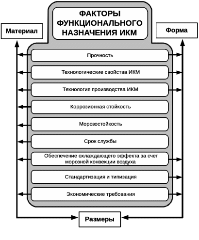 Для рассматриваемой конструкции охлаждающей скальной наброски был определен перечень факторов функционального назначения, влияющих на формообразование ИКМ. Схема связей этих факторов с выбором материала, формы и размеров приведена на рисунке 6.1[8].