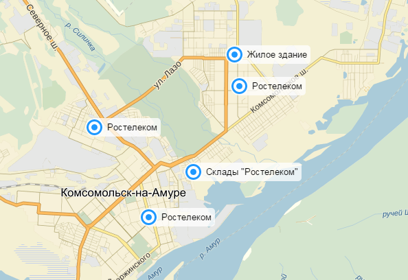 Рисунок 1.2 Расположение филиалов ОАО Ростелеком в г. Комсомольск-на-Амуре