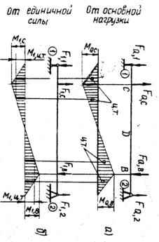 Нагрузки в точках В и С и реакции в опорах 1 и 2 от единичной силы