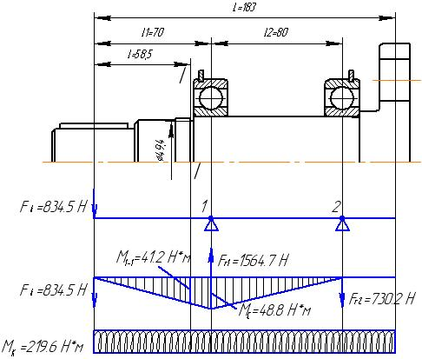 На рис. представлена конструкция выходного вала редуктора механизма передвижения кран-балки, а так же расчётная схема и эпюры изгибающих М и крутящего МК моментов, продольной осевой силы.