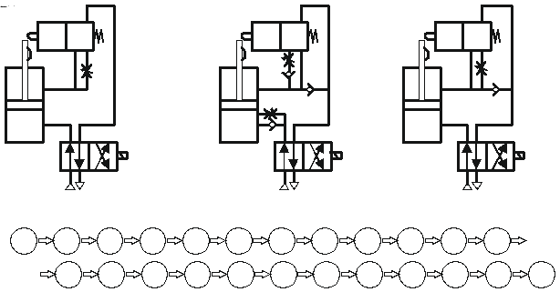 Для реализации движения поршня по схеме «медленное перемещение – быстрое – медленное, холостой ход с высокой скоростью», выберете схему привода и дополните переключатель П каналами. Кратко опишите рабочий ход этого пневмопривода.