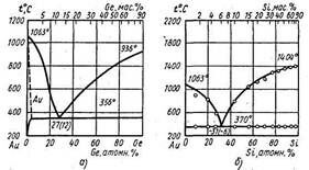 Пайкой эвтектическими сплавами присоединяют полупроводниковые кристаллы к корпусам. Золочение контактирующих поверхностей каких-либо ощутимых результатов не дает. В качестве эвтектических используют сплавы золото - германий или золото -- кремний, диаграммы состояния, которых показаны на рисунке 1, а, б.