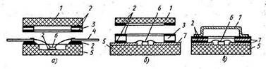 Рисунок 2. Корпуса ИМС, в которых пайкой стеклом выполняется монтаж кристалла, присоединение выводов и- герметизация (д), изоляция проводящих слоев и герметизация (б), изоляция токоведущих дорожек и герметизация (в):